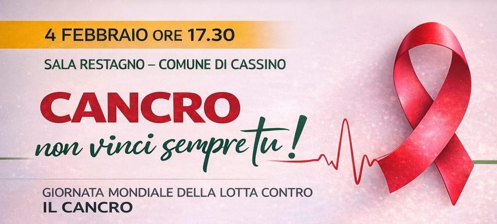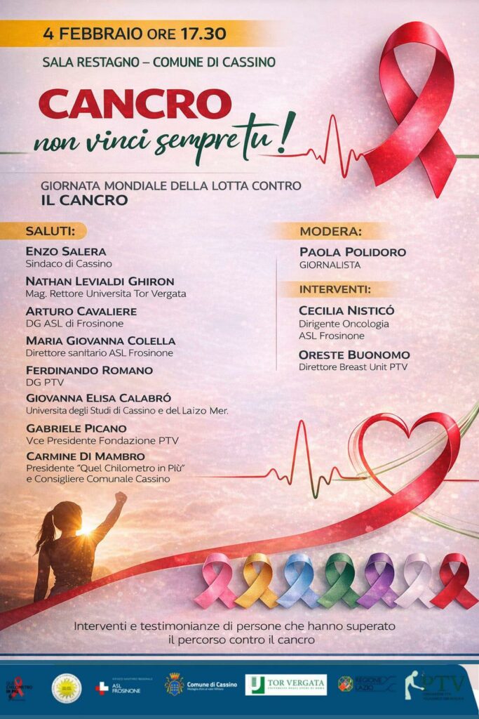 In occasione della Giornata Mondiale della Lotta contro il Cancro un momento importante di confronto tra professionisti e cittadini. Con testimonianze e un dibattito aperto. L’appuntamento è per il 4 febbraio alle 17.30 in sala Restagno, saranno presenti il sindaco Enzo Salera, Nathan Levialdi Ghiron, Rettore dell’Università Tor Vergata, Arturo Cavaliere, Dg Asl di Frosinone, Maria Giovanna Colella, Direttore sanitario Asl Frosinone, Ferdinando Romano, Dg Ptv, Giovanna Elisa Calabrò, Università degli Studi di Cassino e del Lazio meridionale, Gabriele Picano, Vice Presidente Fondazione Ptv e Carmine Di Mambro, Presidente dell’associazione “Quel chilometro in più” e consigliere comunale di Cassino.