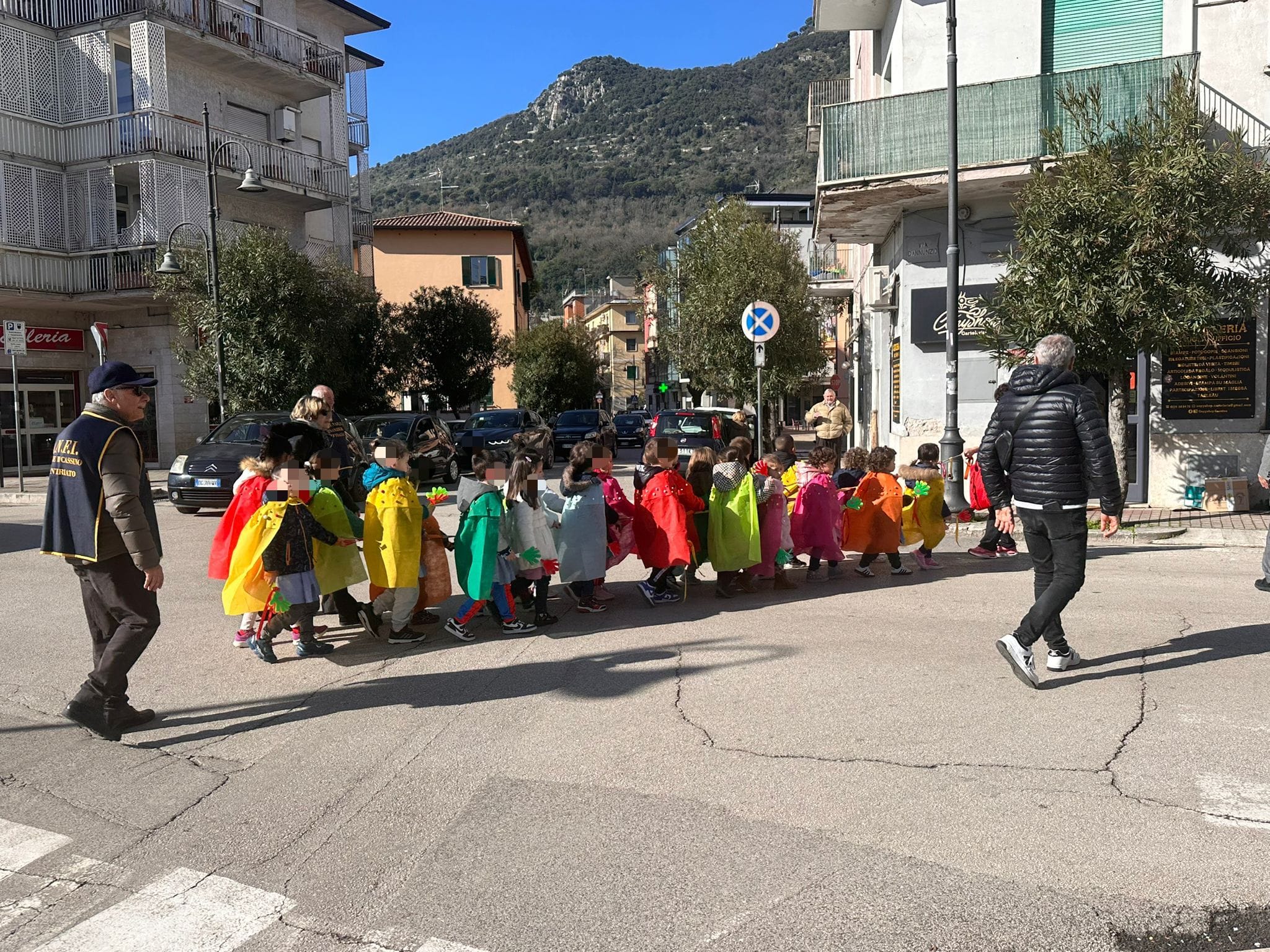 Un cielo azzurro e un sole tiepido che già profuma di primavera. Questa mattina i bimbi dell’asilo della scuola Pio Di Meo, Primo Istituto Comprensivo, hanno fatto una passeggiata per le strade del centro. Scortati dalle maestre e dai volontari dell’Anfi i piccoli in fila indiana hanno riempito le strade di risate e canzoncine. Con cappellini e mantelline sgargianti realizzate con cartapesta e pon pon variopinti hanno regalato un sorriso ai passanti, anche a quelli distratti che solitamente corrono senza soffermarsi troppo su cosa li circonda. Un sorriso, una filastrocca e un’esplosione di colori, per ricordarci che la città è viva anche grazie ai “bruchini” di cartapesta.