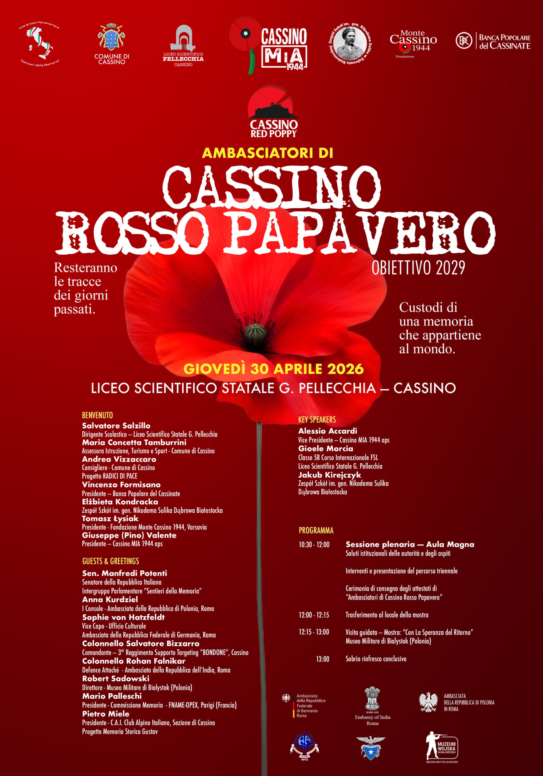 Cassino – Il rosso dei papaveri, simbolo universale del sacrificio sui campi di battaglia, oggi non è più solo un fiore della memoria, ma il distintivo di una nuova generazione di narratori. Giovedì 30 aprile 2026, l’Aula Magna del Liceo Scientifico Statale “G. Pellecchia” di Cassino si trasforma in un crocevia diplomatico e culturale per la cerimonia conclusiva del progetto “Ambasciatori di Cassino Rosso Papavero”. Dalle ore 10:30 alle 13:00, la città martire celebra il compimento di un percorso triennale che ha visto gli studenti trasformarsi in “narratori di comunità”, capaci di raccontare le ferite e la rinascita della Linea Gustav a un pubblico internazionale.
