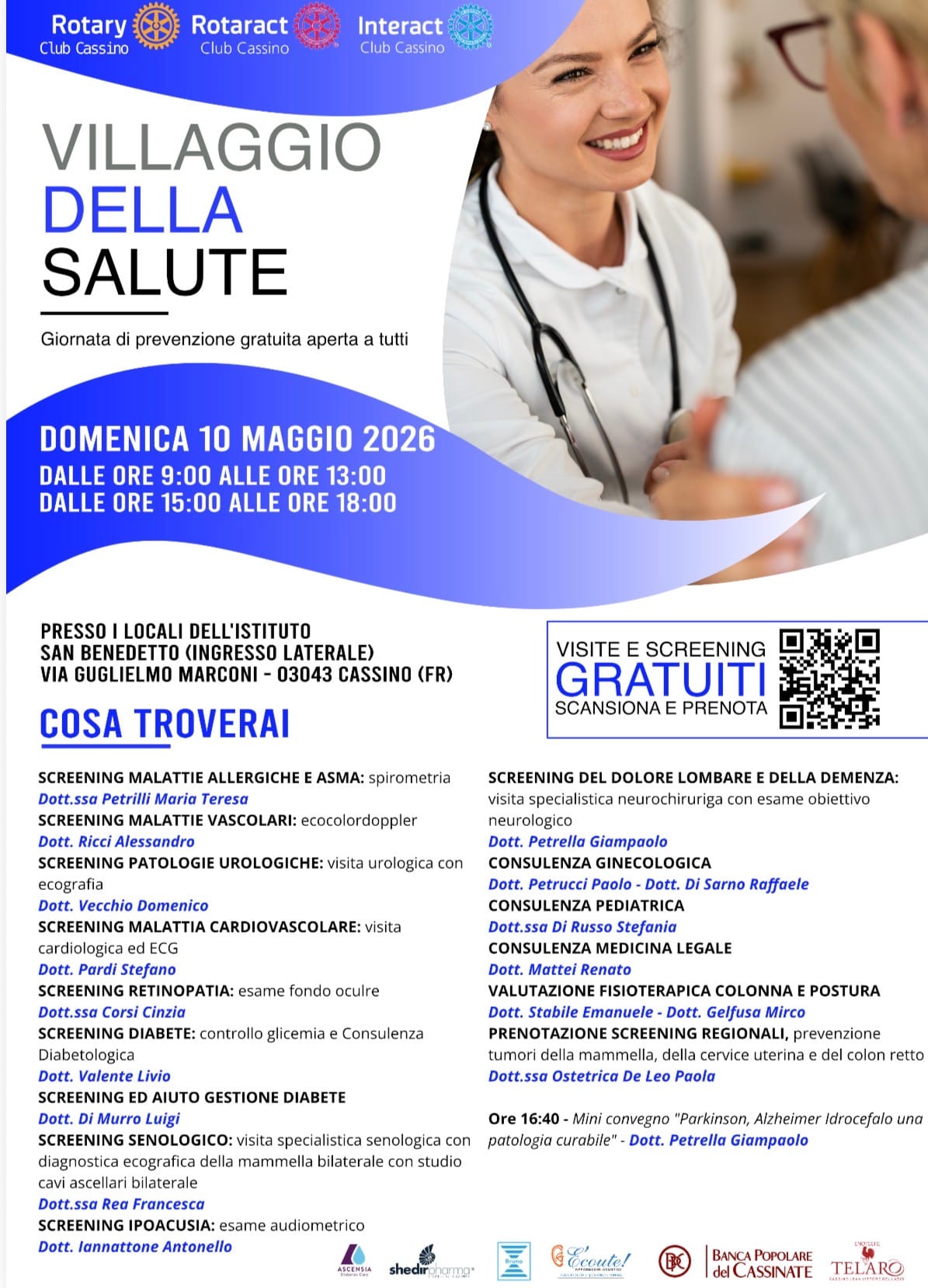 Cassino – La prevenzione torna protagonista nel territorio del cassinate. Domenica 10 maggio 2026, presso i locali dell’Istituto San Benedetto in via Guglielmo Marconi, si terrà la seconda edizione del “Villaggio della Salute”. L’iniziativa, promossa dal Rotary Club Cassino in sinergia con i giovani del Rotaract e dell’Interact, mira a offrire ai cittadini un accesso diretto e gratuito a screening e consulenze specialistiche.